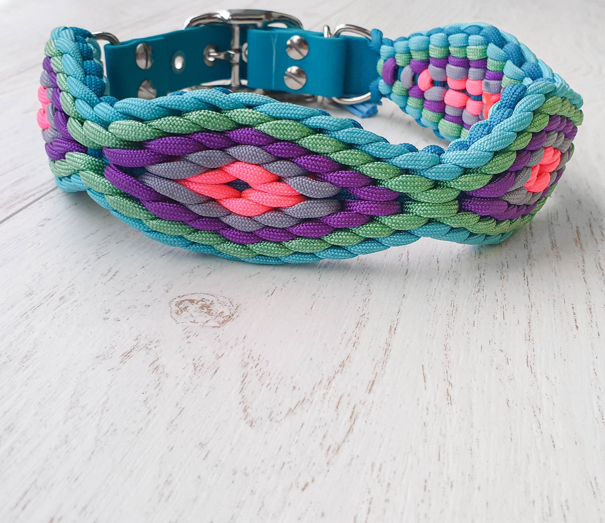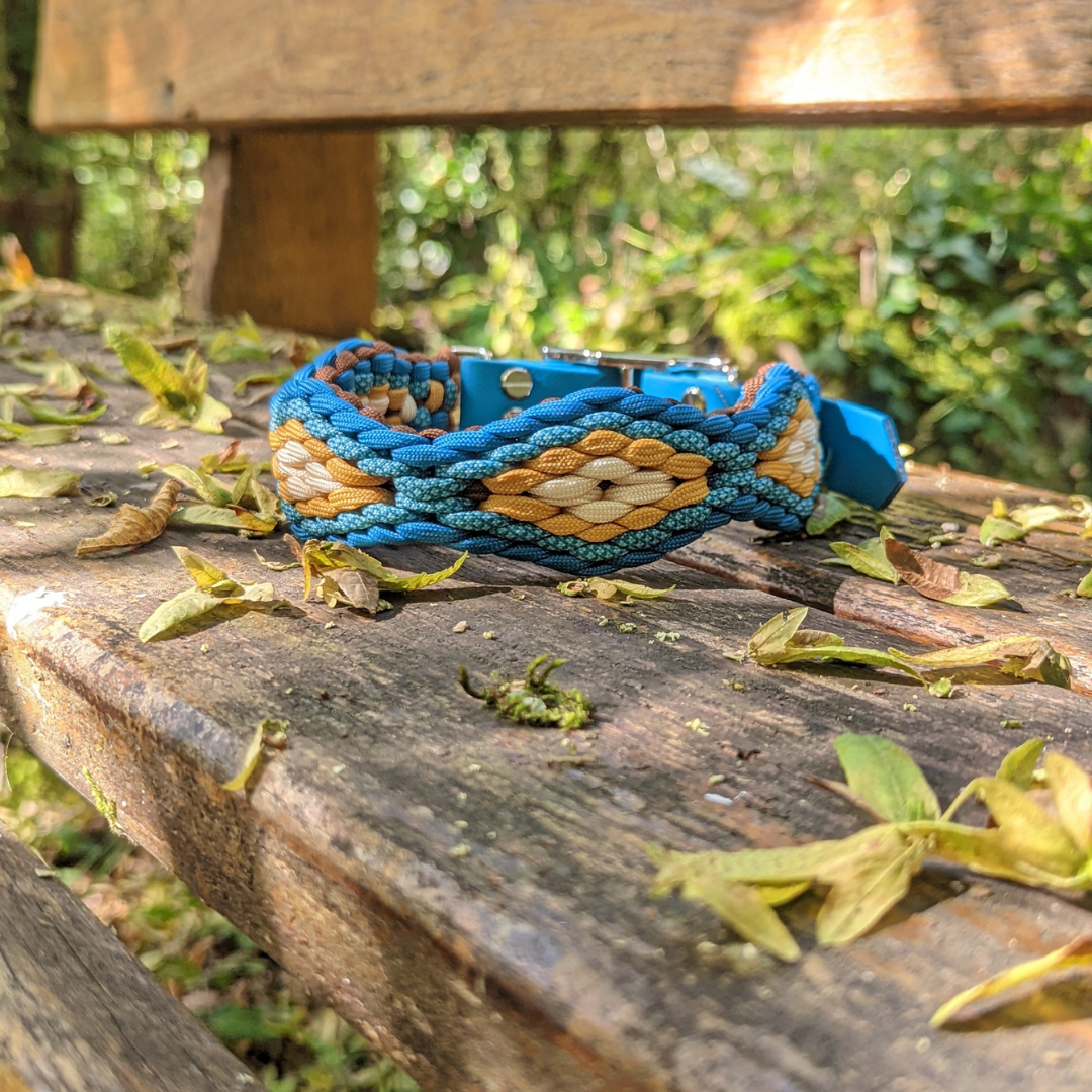 Son tressage en paracorde, solide et travaillé, dessine des motifs qui rappellent les entrelacs de lianes et les symboles gravés dans l’écorce des arbres anciens.
