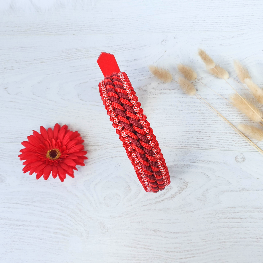 Son rouge intense rappelle les couchers de soleil sur les flots, et son tressage symbolise le mouvement éternel des vagues.