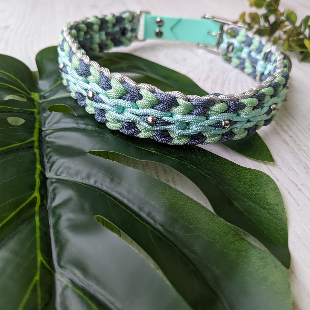 Tressé à la main en paracorde et BioThane®, il incarne la beauté, la force et la fluidité des flots.