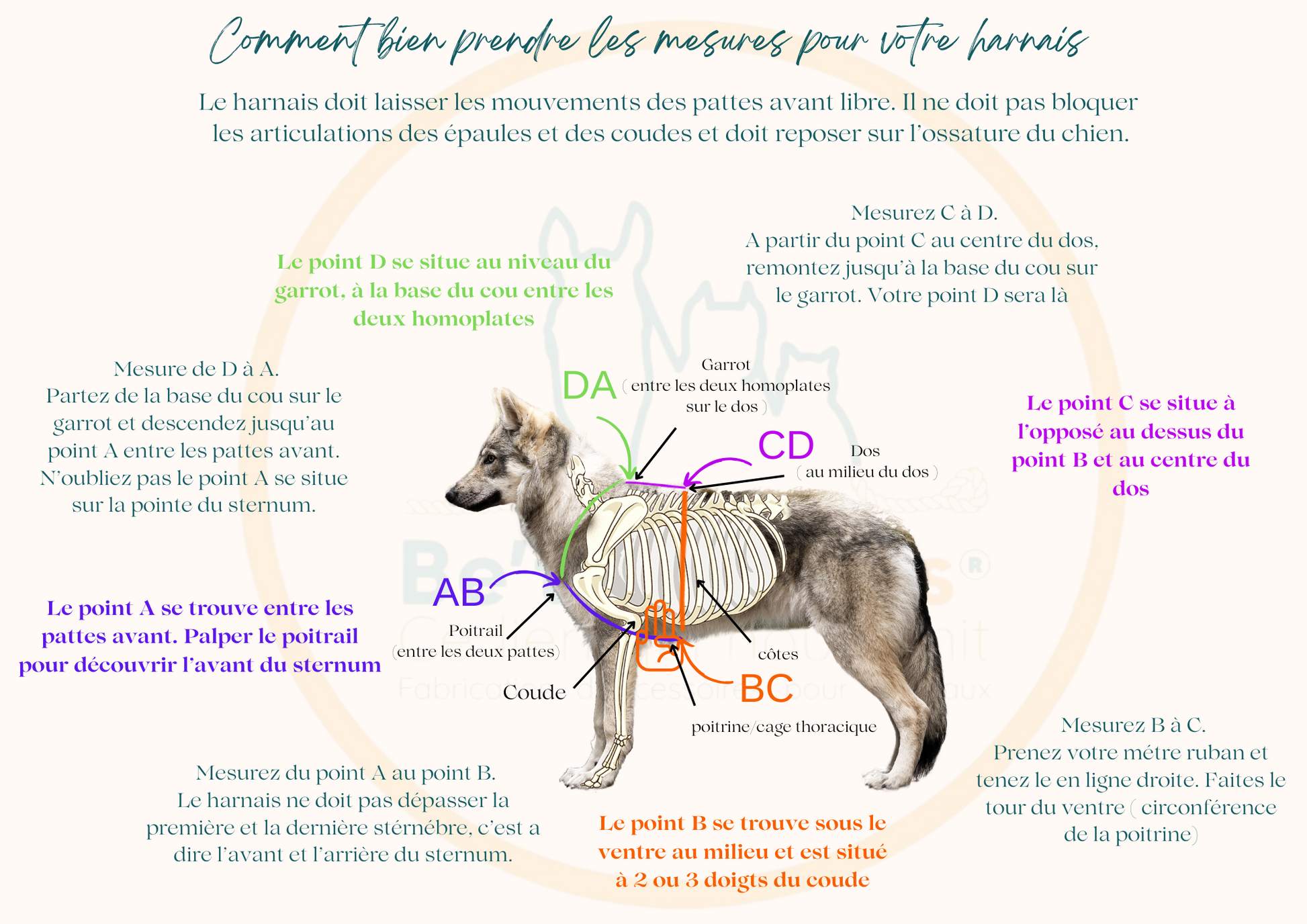👉 Pour garantir un ajustement parfait, il vous suffit de mesurer comme indiqué sur le schéma en photo. AB sous le ventre, puis BC le tour du thorax, ensuite CD le dos et enfin AD les épaules. Indiquez les mesures dans les champs concernés.