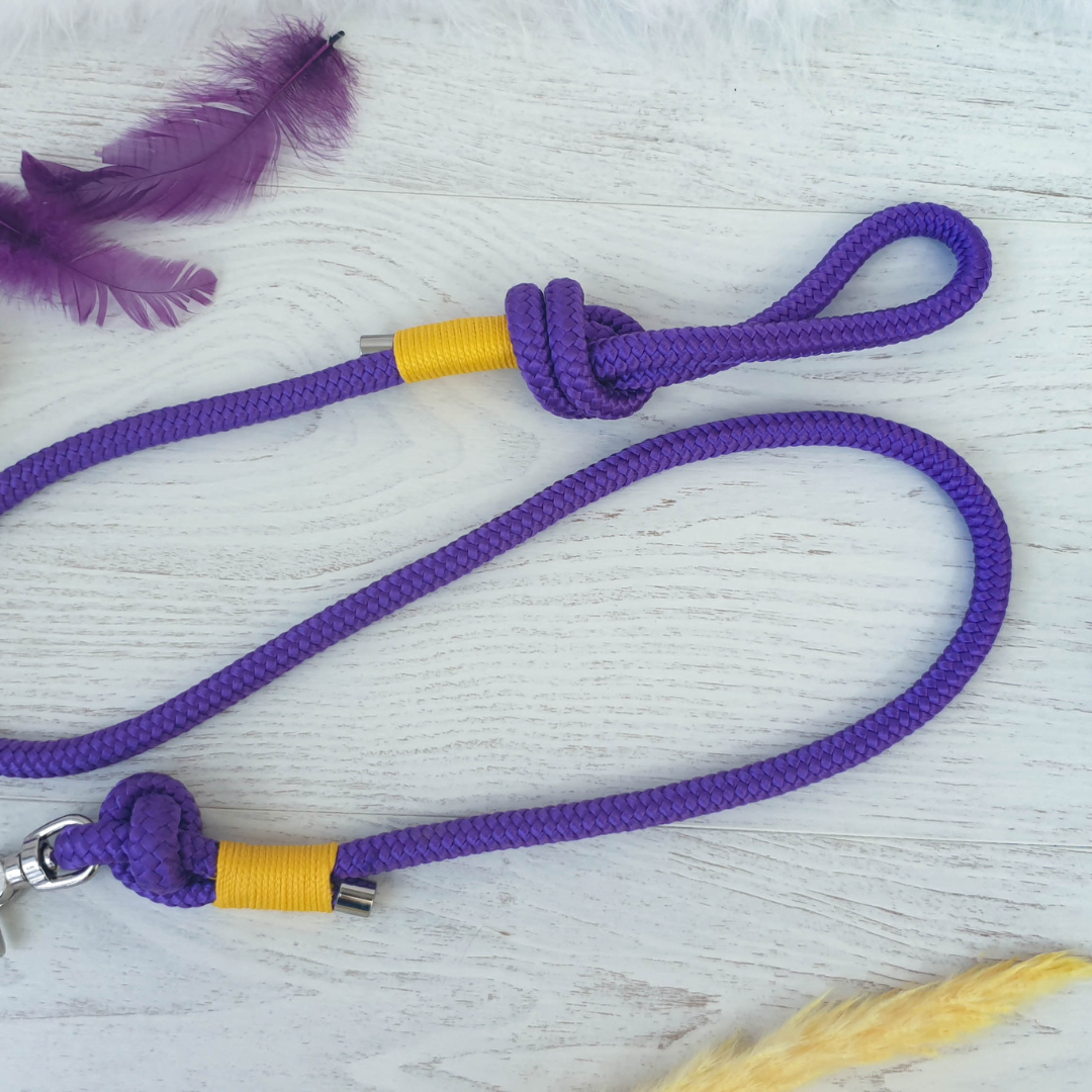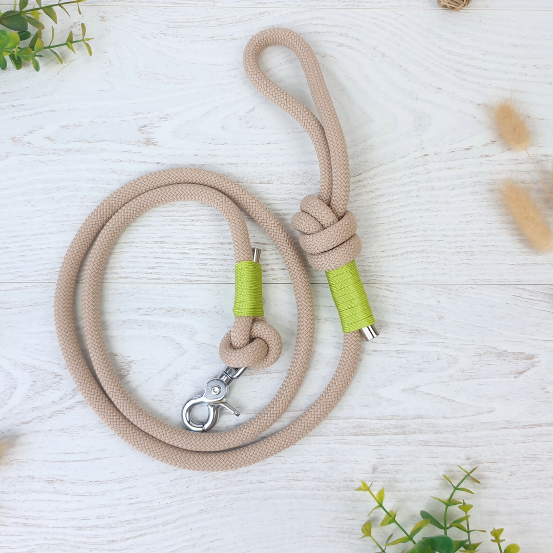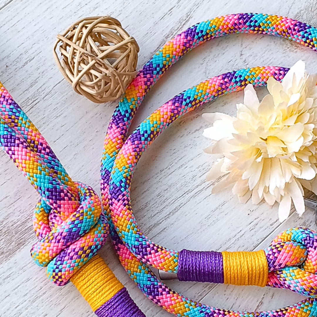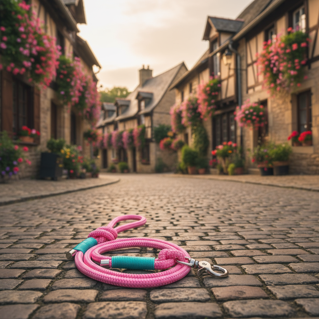 une corde de laisse solide, inspirée des cordages d’aventure, et une finition en corde type 1 tressée avec soin, symbole du lien tissé entre deux âmes.