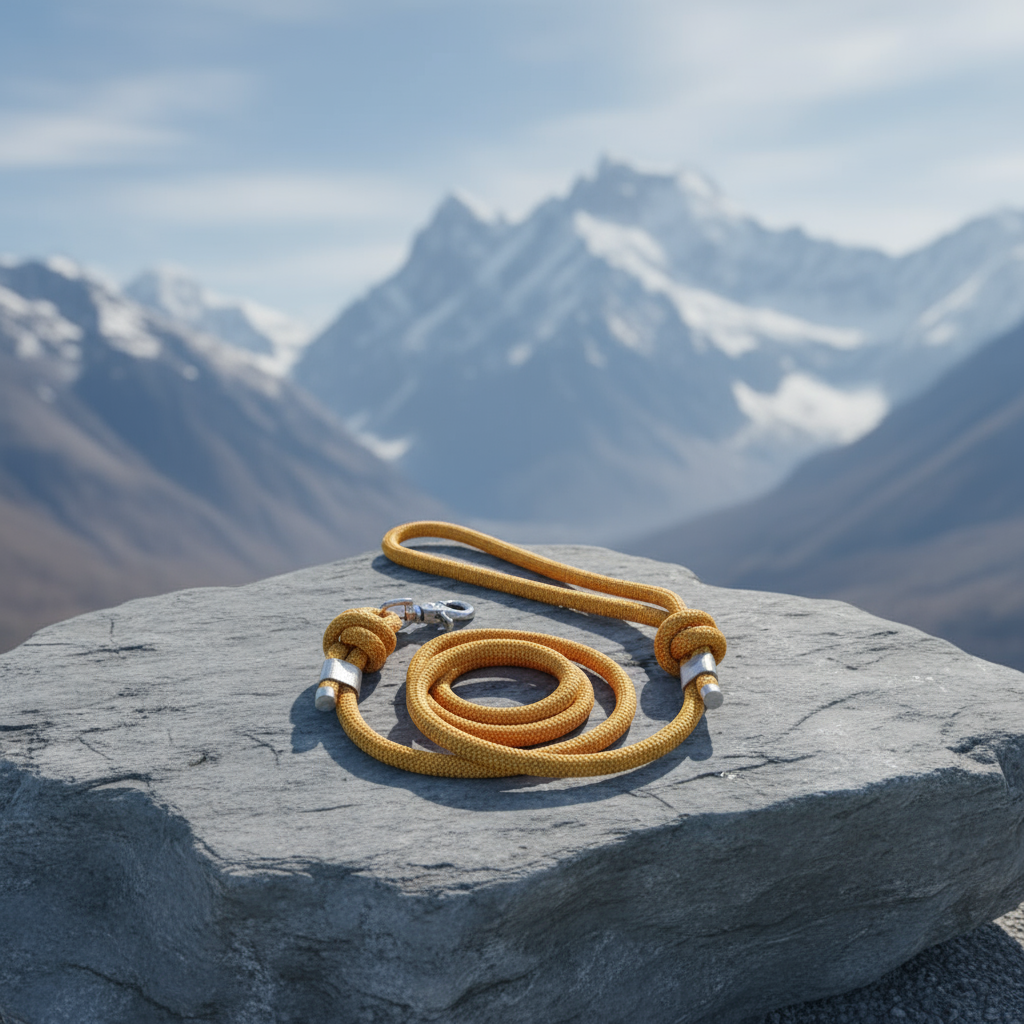 Inspirée du lien indéfectible entre les guides de montagne et ceux qu’ils accompagnent, cette laisse symbolise la solidité, la fiabilité et la complicité du duo que rien n’arrête.