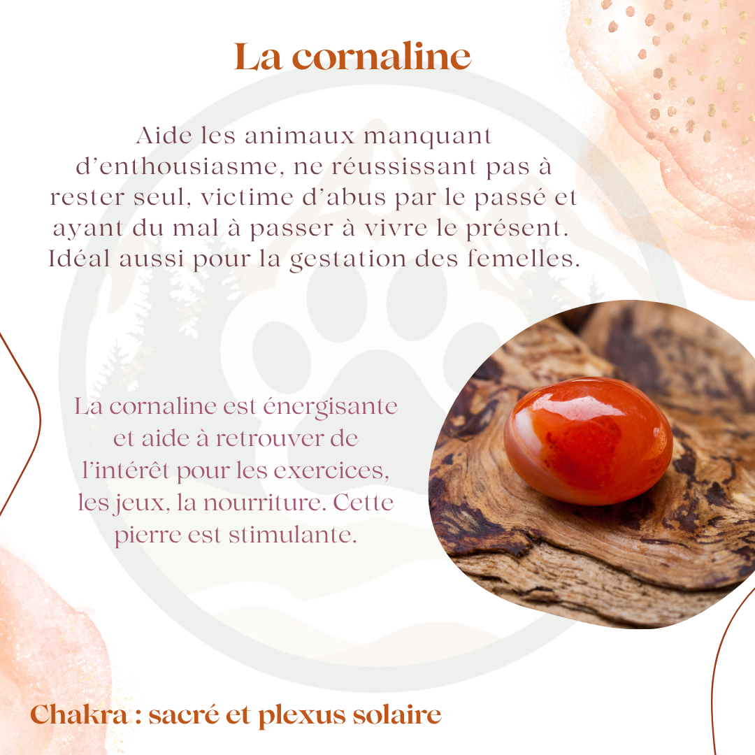 La cornaline est une pierre énergisante qui agit sur le chakra sacré. Cette pierre apaise l’anxiété, aide à la concentration, stimule les facultés mentales et donne de l’énergie aux animaux qui la porte. Elle calme ceux qui sur-réagisse envers leur congénères et calme les angoisses de ceux ne voulant pas rester seul. .